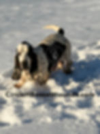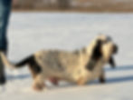 ​Flash is a 75% European Basset Hound weighing 65 pounds with more of a traditional American-style build. He is a handsome black and tan with a classic Basset expression. Flash has a laid-back personality and is happy to take life at a slower pace, but he still enjoys being right in the middle of whatever is happening around the ranch. He’s an easygoing, good-natured hound who loves being part of the action with his people.